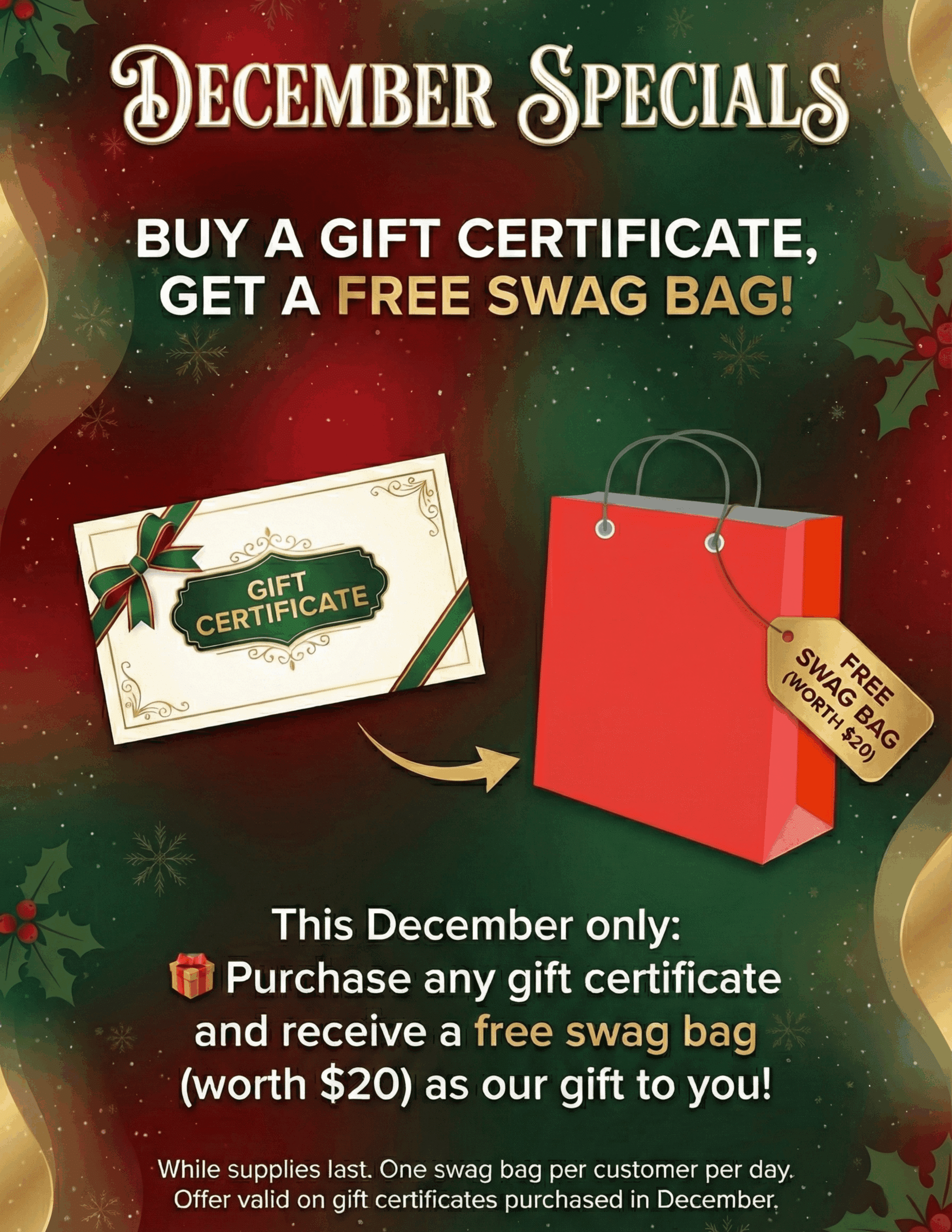 All month long, when you purchase a gift certificate, you'll receive a complimentary swag bag (a $20 value) as our way of saying thank you. One swag bag per customer per day. Available while supplies last. Stock up on gifts for friends, family, or coworkers – enjoy a little something extra for you!